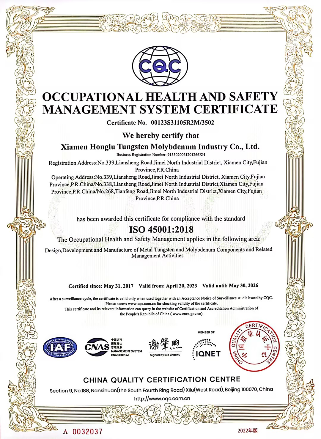 Established in 1992, Xiamen Honglu Tungsten Molybdenum Industry Co., Ltd. with registered capital of RMB 361,005,000 is a state-controlled Sino-Korea joint venture.?The Company is one of the core members of public-listed Xiamen Tungsten Co., Ltd. and is also one of the State New High-Tech Companies in China. The Company has the first “Post Doctoral Programme” in Chinese tungsten and molybdenum processing industry, and also jointly set up the “Rare Metal Processing Laboratory” with Metal Research Institute of Chinese Academy of Sciences.?