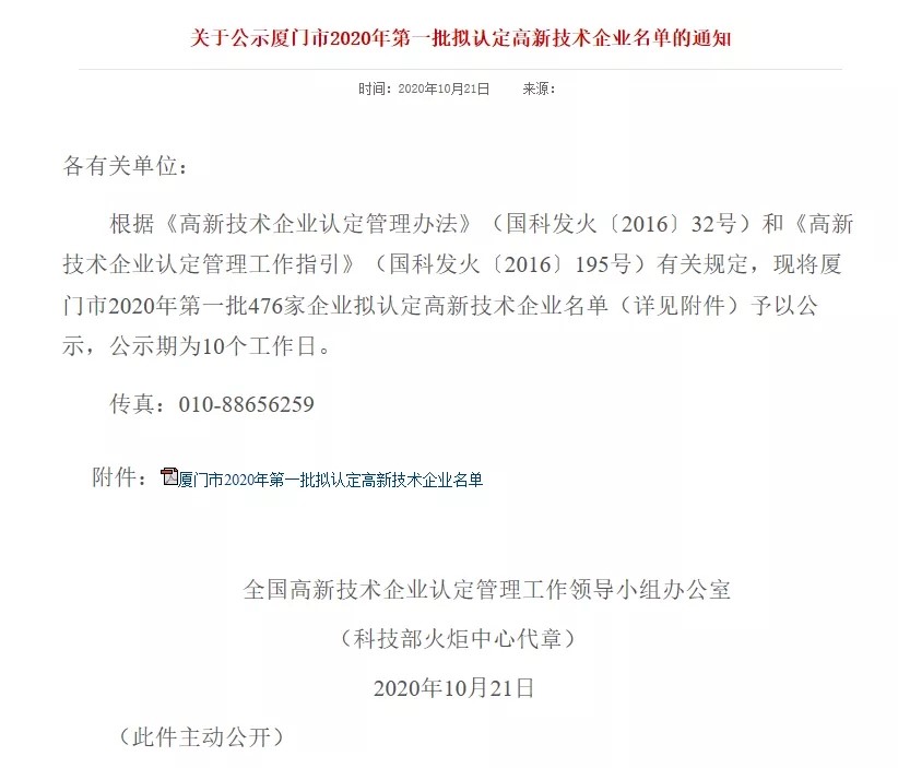 以下為《關于公示廈門市2020年第一批擬認定高新技術(shù)企業(yè)名單的通知》公示通知文件。